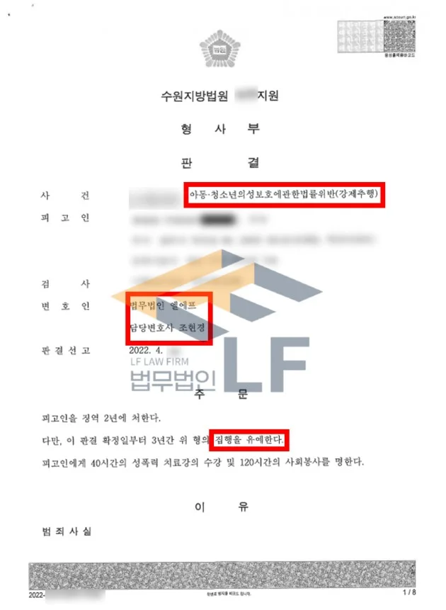 ■ 아동 청소년의 성 보호에 관한 법률 위반 강제추행죄 집행유예 처분사례