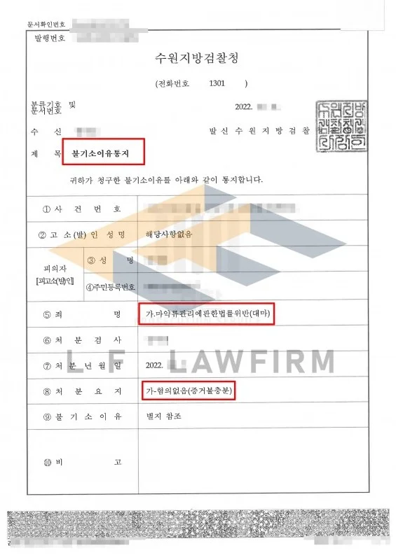 해당 사건을 살펴본 변호인은 의뢰인과 상담을 한 후 어떤 경위로 클럽에서 대마를 얻게 되었고, 흡연을 하게 된 것인지 확인을 해보았습니다. 그리고 1회 경찰 진술 내용을 정보공개청구를 통해 확인한 후 모발 감정서와 시기적으로 일치하는 것이 맞는지 등을 강조하는 내용으로 변호인의견서를 준비하여 제출하였습니다. 이후 담당 수사관 면담과 담당 검사 면담을 거쳐 최종적으로 무혐의 처분을 받아 혐의를 벗을 수 있었습니다.