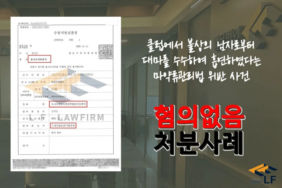 의뢰인은 클럽에서 성명불상자로부터 불상의 대마를 수수하여 흡연하였다는 혐의로 입건이 되었고 1회 경찰 조사를 받은 후 사건을 맡아 진행하게 되었습니다.