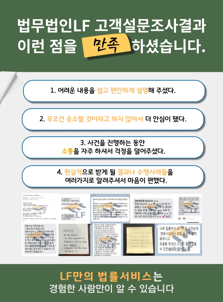 성범죄 혐의는 빠른 시일내에 변호사를 선임해 즉각 대처하는 것이 가장 중요하다고 보고 있습니다. 그렇기에 사건에 어떠한 이유로 연루가 되었든 해당 사건을 다수 경험한 변호인의 조력을 받아보는 것이 좋습니다. 저희 법무법인 엘에프에서는 사건이 마무리 되는 날까지 의뢰인과 지속적인 소통을 하면서 문제가 해결될 수 있도록 맞춤 솔루션을 제시해 드리고 있습니다.