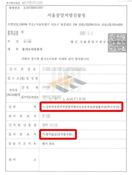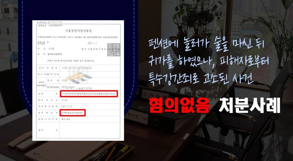 이에 변호인은 특수강간죄를 다투고자 변호인의견서를 통해 당시의 상황을 담은 의견서를 제출하였고 이어 피해자 진술의 신빙성을 적극적으로 탄해가는 변론을 수사기관에 펼쳐 혐의없음 처분을 받을 수 있도록 하였습니다.