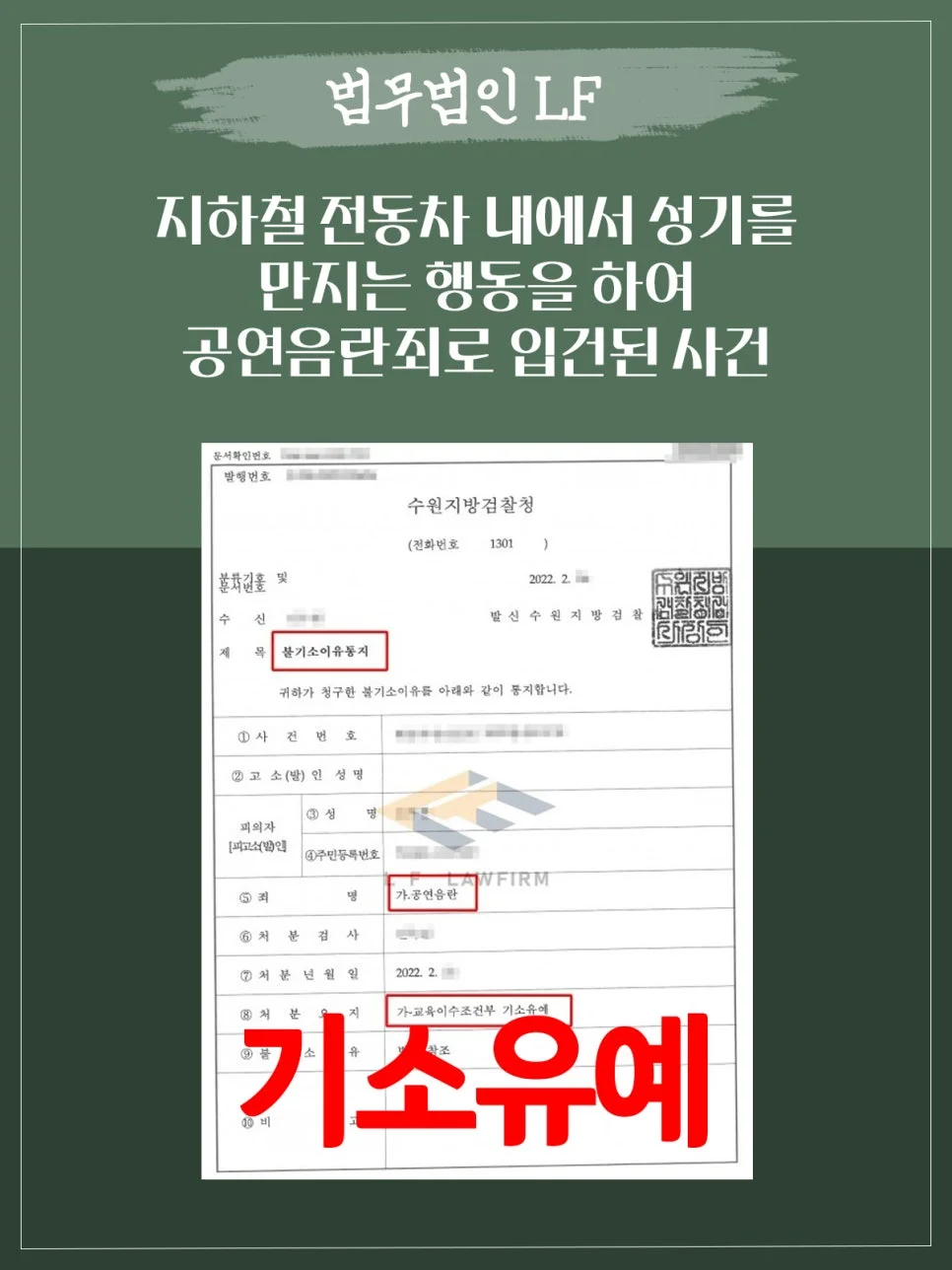 의뢰인은 지하철 전동차 내에서 성기를 만지는 등의 공연음란죄로 입건이 되었습니다. 경찰은 목격자의 진술을 토대로 입건하여 의뢰인을 조사하게 되었고, 경찰조사를 받기 전 상담을 하고 절차를 진행하게 되었습니다. 의뢰인은 직업의 특성상 공연음란죄로 처벌을 받았다는 사실이 근무중인 회사에 알려지게 된다면 징계를 받고 추가적인 불이익이 있을 수 있는 상황이었습니다.