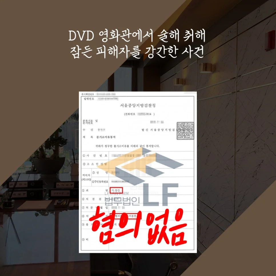의뢰인은 DVD 영화관에 술에 취해 잠든 피해자의 반항을 억압하고 1회 간음한 강간죄 혐의로 조사를 받게 되었습니다. 의뢰인은 당시 피해자가 생리 중이었기 때문에 성관계를 하지 않았다고 주장하였으며 반항을 억업하고 피해자를 폭행 또는 협박하는 등의 행동을 결코 없었다며 억울해하는 상황이었습니다