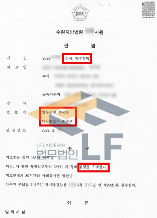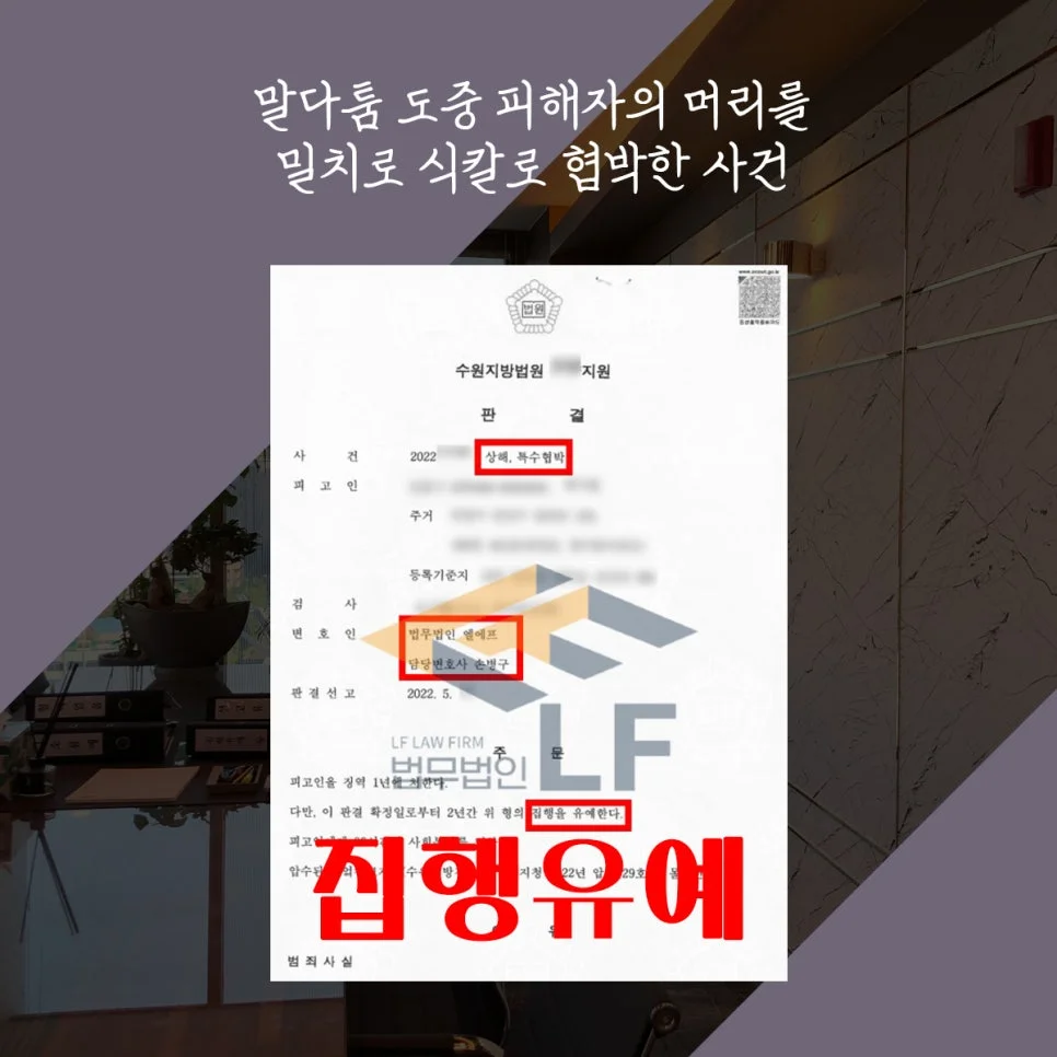 의뢰인은 피해자와 술을 마신 뒤 말다툼을 하던 중 계속 시비를 거는 피해자를 밀치게 되었고, 그럼에도 불구하고 피해자가 계속 시비를 걸자 부엌에 있던 식칼을 이용하여 피해자를 죽여버리겠다고 협박하게 되었고 이에 피해자의 경찰 신고로 인하여 상해죄와 특수협박죄로 수사기관이 조사를 받은 뒤 재판을 받게 되었습니다. 의뢰인은 상대방과 다툼이 있긴 하였지만, 식칼을 이용하여 협박하였기 때문에 죄질이 좋지 않았고 이에 더하여 상대방이 상해까지 입었기에 엄중한 처벌이 예상되는 상황이었습니다.