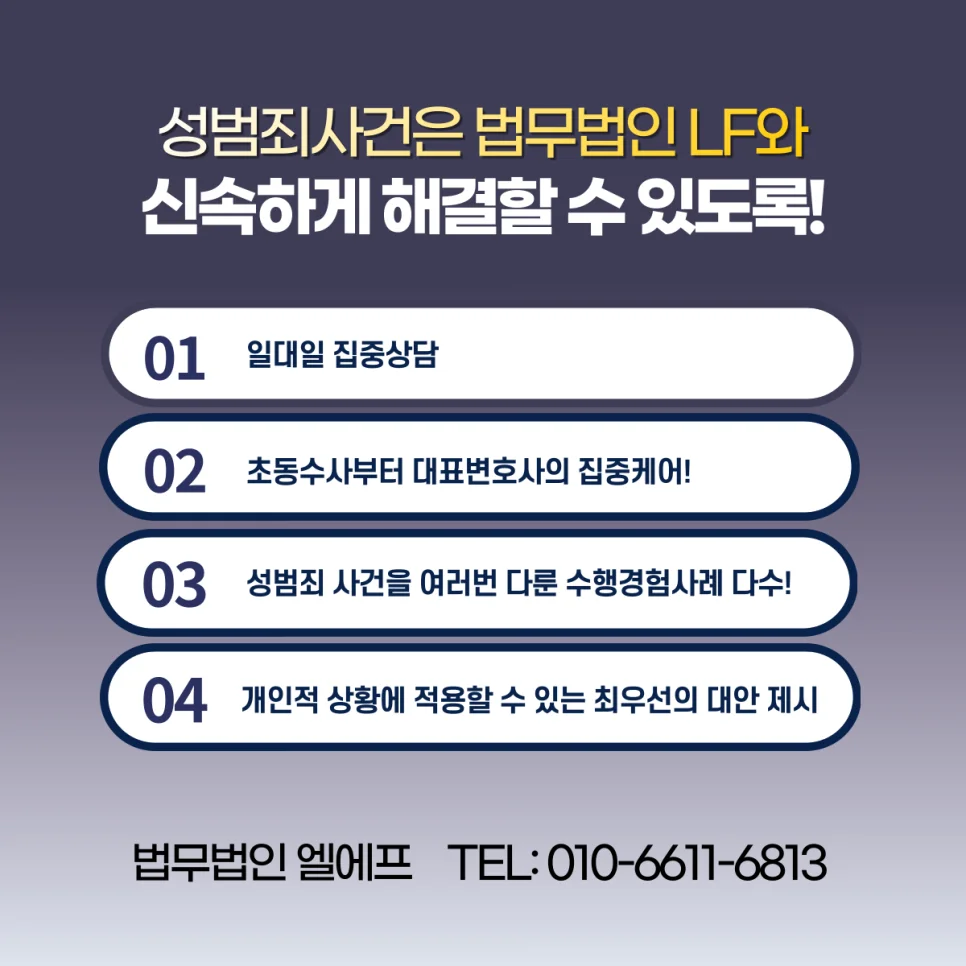 저희 법무법인 엘에프에서는 경험과 노하우가 많이 쌓아 올린 형사전문변호사가 직접 1:1 상담을 통해서 의뢰인의 사건에 대해 정확하게 분석한 상황에 맞는 확실한 해결책을 제시하여 도움을 드리고 있습니다. 형사사건에 대해 혼자 고민하지 마시고 저희 LF 조력으로 확실한 방향을 잡아서 원하는 결과를 만나 보시기 바랍니다.