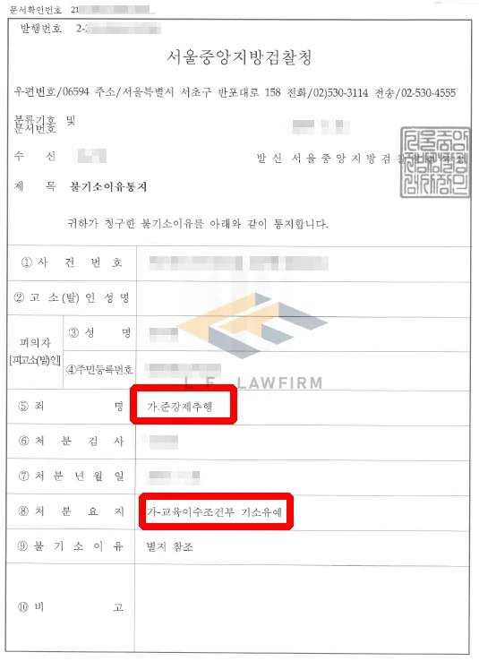 그래서 변호인은 피해자들 전원과의 합의도 이끌어 내게 되었으며, 이후 의뢰인의 양형자료를 받아 변호인 의견서를 통해 제출하는 등의 적극적인 변호활동을 하여 기소유예 처분으로 받을 수 있게 되었습니다.