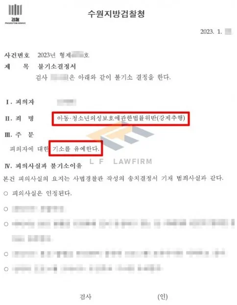 의뢰인은 익명인 랜덤 채팅 어플을 통해 아동청소년인 피해자를 알게 되었고, 피해자를 한 공원에서 만난 뒤 이야기를 나누던 과정에서 가슴을 만지고 키스를 하고 끌어안는 등의 행동을 하였습니다. 이러한 행동으로 피해자로부터 강제추행으로 고소를 당하여 수사기관의 조사를 받게 되었습니다.