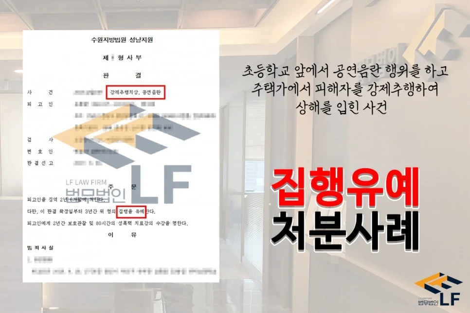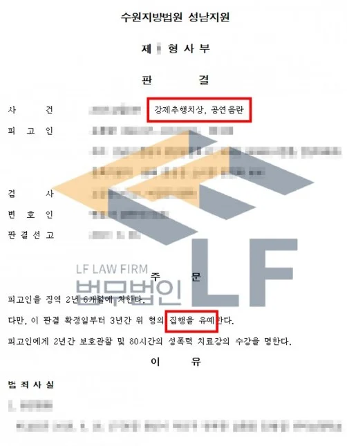의뢰인은 이미 한 차례 공연음란죄로 벌금형을 선고받은 적이 있으며, 범행 방법과 추행의 정도가 가볍지 않았기에 수위 높은 처벌이 예상되는 상황이었습니다. 그래서 변호인은 의뢰인이 범행에 대해 모두 인정하고 깊이 반성하고 있으며 재범 방지를 위해 정신과 치료 및 약물 치료를 받고 있음을 변론하여 선처를 구하였고, 의뢰인의 양형 자료를 바탕으로 변호인 의견서를 작성해 제출하는 등의 조력활동을 하여 집행유예 처분을 받을 수 있도록 하였습니다.