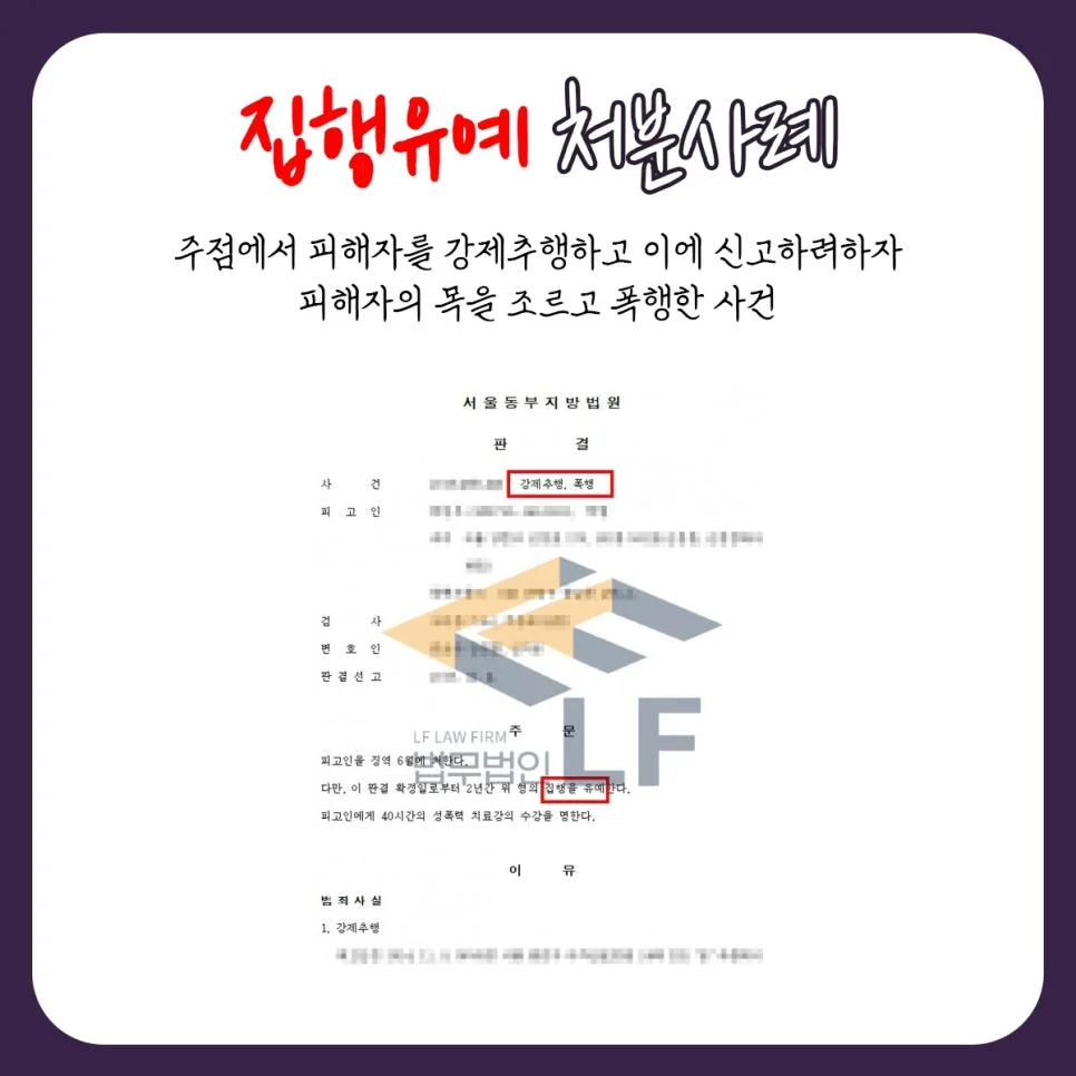의뢰인은 피해자를 강제추행한 이후 폭행까지 한 것으로 죄질이 매우 좋지 않다고 판단이 되고 있었으며, 피해자와의 합의가 이루어지지 않은 상황에서 엄벌에 처해질 가능성이 높았습니다. 그래서 변호인은 의뢰인에게 필요한 양형 자료를 안내하고 작성과 수집에 도움을 드렸으며, 자료를 바탕으로 변호인 의견서를 작성한 후 제출하여 집행유예로 선처를 받을 수 있게 하였습니다.