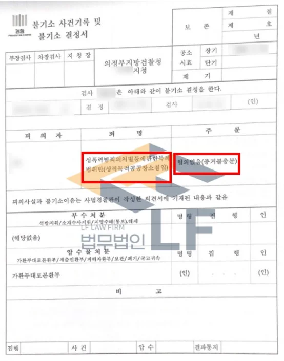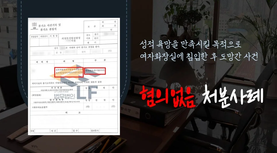 또한 화장실내에서 다른 행동을 한 사실이 없다는 점을 입증하기 위해 건물 복도 CCTV 영상을 확보하였고 족적일치여부감정과 포렌식수사를 동원하여 의뢰인이 단순히 용변을 보려는 목적으로 화장실에 들어갔다는 사실을 밝혀내 해당 사건에 대해서 혐의 없음 처분을 받아내게 되었습니다.