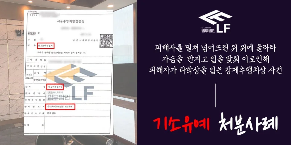 피해자를 밀쳐 넘어뜨린 뒤 위에 올라타 가슴을 만지고 입을 맞춰 이로 인해 타박상을 입은 강제추행치상 사건