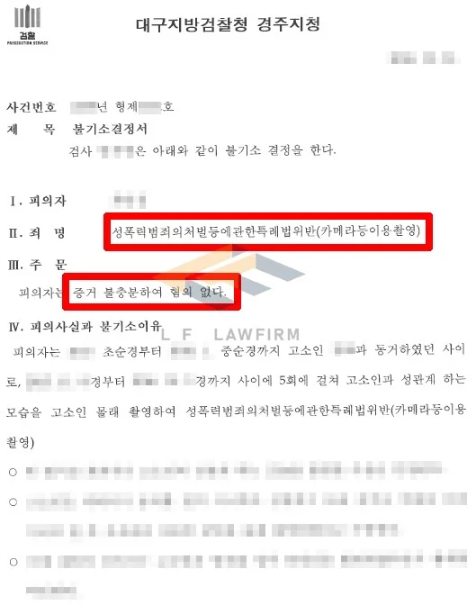 의뢰인은 동거를 하면서 성관계 장면을 휴대전화기 카메라 기능을 이용해 촬영하게 되었는데, 피해자와 헤어진 뒤 느닷없이 피해자가 불법촬영이라며 의뢰인을 고소하였고, 이에 의뢰인은 성폭력 범죄의 처벌 등에 관한 특례법 위반죄로 수사기관의 조사를 받게 되었습니다.