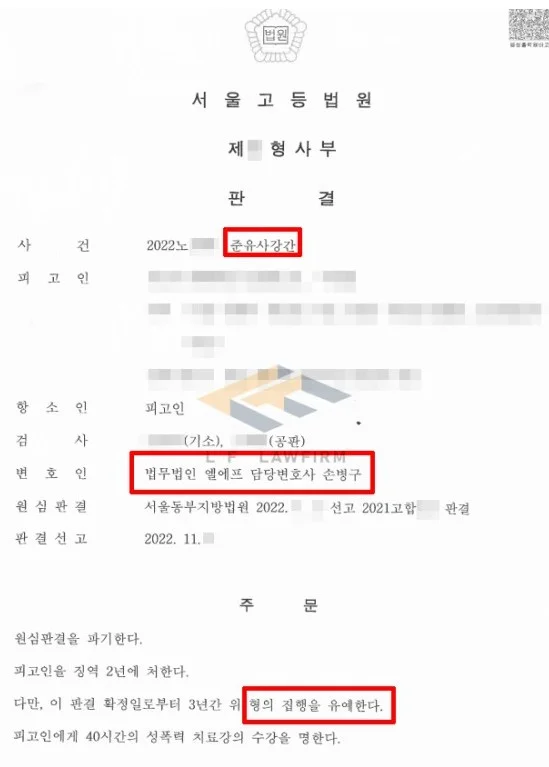 이후 의뢰인과 혐의하여 혐의를 인정하되 피해자와 합의 후 집행유예 판결을 받기로 전략을 세웠고, 변호인으로서 피해자 측에 연락하여 피해자와 라포를 형성한 뒤 원만한 합의를 이끌어 내었으며, 합의서와 처벌 불원서를 법원에 제출하며 선처를 받을 수 있도록 적극적으로 조력할 결과 집행유예 판결을 받게 되었습니다.