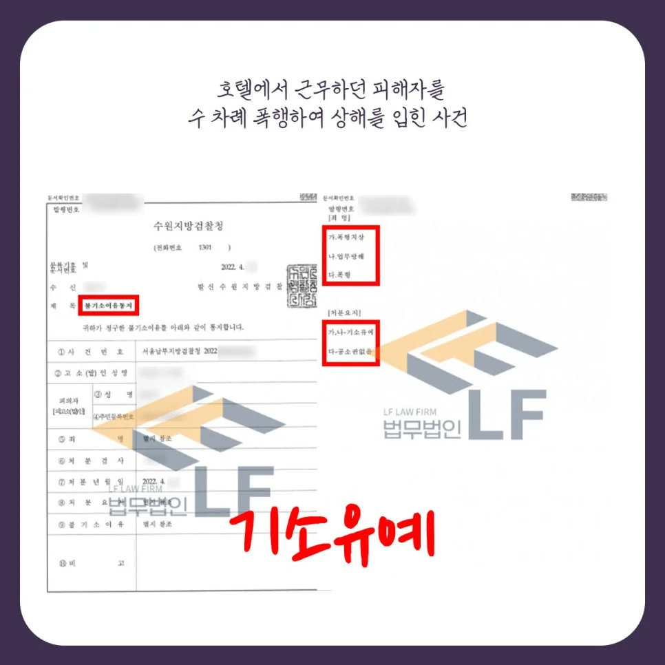 의뢰인은 모든 사실에 대하여 자백을 하는 상황으로 이에 저는 의뢰인과의 상담을 통해 사건해결을 위해 필요한 정상 자료 목록을 안내하였고 동시에 피해자와의 원만한 합의가 필요함을 말씀드렸습니다. 이후 의뢰인의 변호인으로서 피해자 측 변호인을 통한 피해회복 절차를 조력하였으며 의뢰인에게 전달받은 정상자료를 토대로 변호인 의견서를 작성해 선처를 요청하였습니다. 그래서 그 결과 폭행치상에 대해 기소유예를 받게 되었습니다.