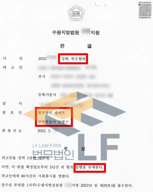 이후 의뢰인이 왜 이 범행을 범할 수 밖에 없었는지 변호인 의견서를 작성하여 제출하게 되었고 피해자의 극심한 거부로 인하여 합의에 이르지 못하게 되었지만, 사건 전후 상황을 모두 고려하여 의뢰인에게 최대한 선처를 하여 줄 것을 변론해 집행유예를 받을 수 있었습니다.