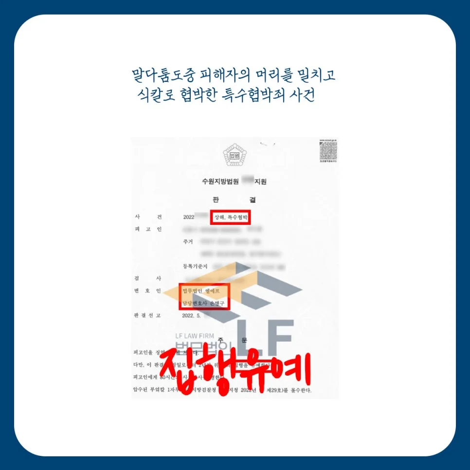 의뢰인은 피해자와 술을 마신 뒤 말다툼을 하던 중 계속 시비를 거는 피해자를 밀치게 되었고, 그럼에도 불구하고 피해자가 계속 시비를 걸자 부엌에 있던 위험한 물건인 식칼을 이용하여 피해자를 죽여버리겠다고 협박하게 되었고, 이에 피해자의 경찰 신고로 인하여 상해죄와 특수협박죄로 수사기관의 조사를 받은 뒤 재판을 받게 되었습니다.