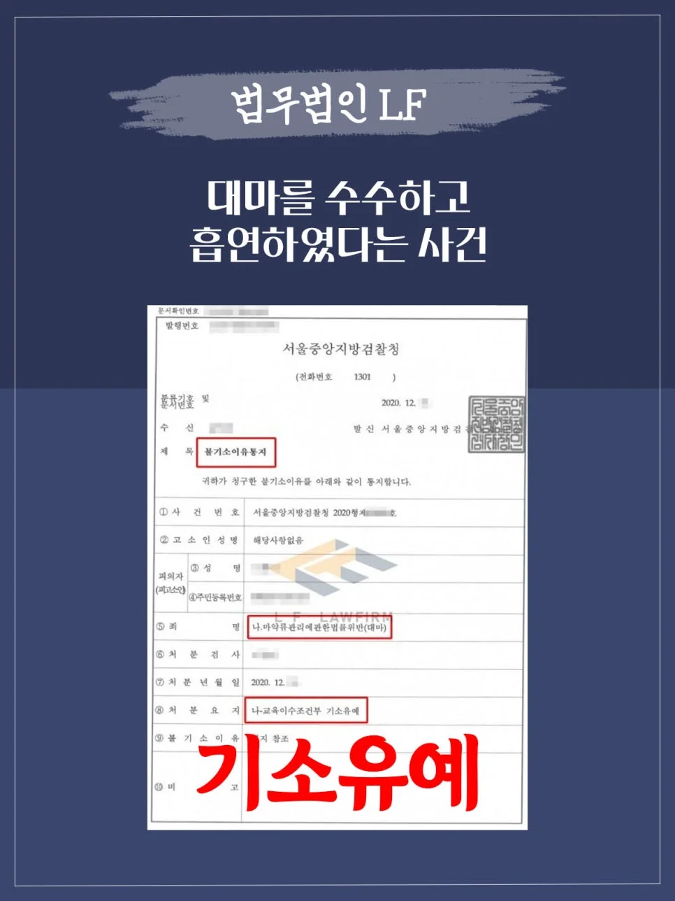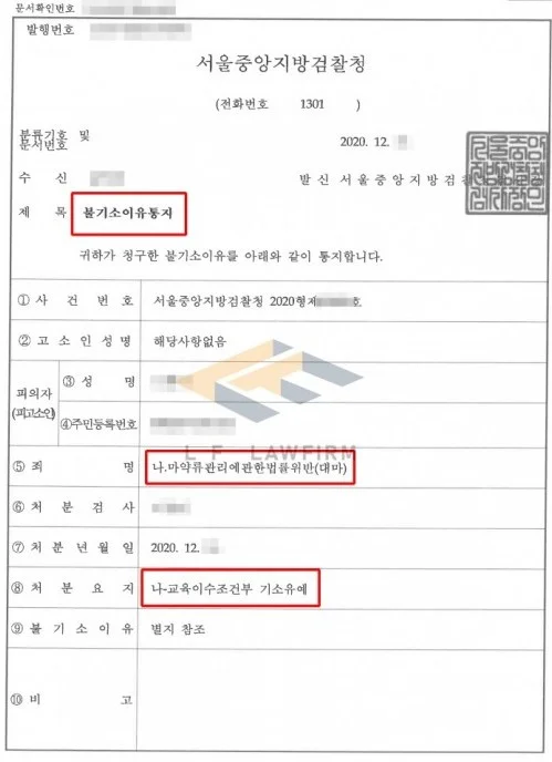 일단 사실관계에 대해 수사기관에 진술을 하는 것이 중요하다 판단되었고, 상담을 하며 대마를 소지하게 된 배경과 어떻게 하여 흡연을 하게 되었는지에 대해 말을 나눠보았습니다. 그리고 조사 참여를 하며 조력을 하였고 이후 정상자료를 받아 변호인의견서를 작성하여 경찰단계에서 제출을 하고 담당 검사에게도 제출을 하여 기소유예를 받을 수 있도록 하였습니다.