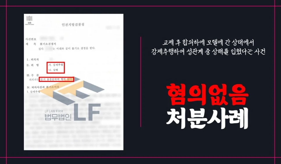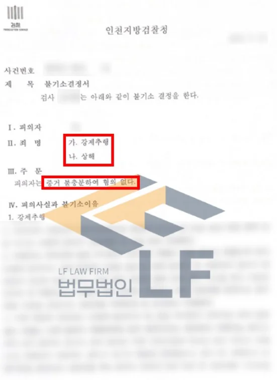 당시 강제추행에 대해서는 추행을 당한 직후 콘돔사용을 조건으로 성관계를 허락했다는 점이 상식적으로 납득이 되지 않는다고 주장을 하였습니다. 그리고 상해혐의에 대해서는 피의자가 성병검사를 한 결과 감염된 사실이 없다는 의사소견서를 바탕으로 변호인의견서를 작성하여 수사기관에 제출하여 해당 사안에 대해 혐의 없음 처분을 받을 수 있게 되었습니다.