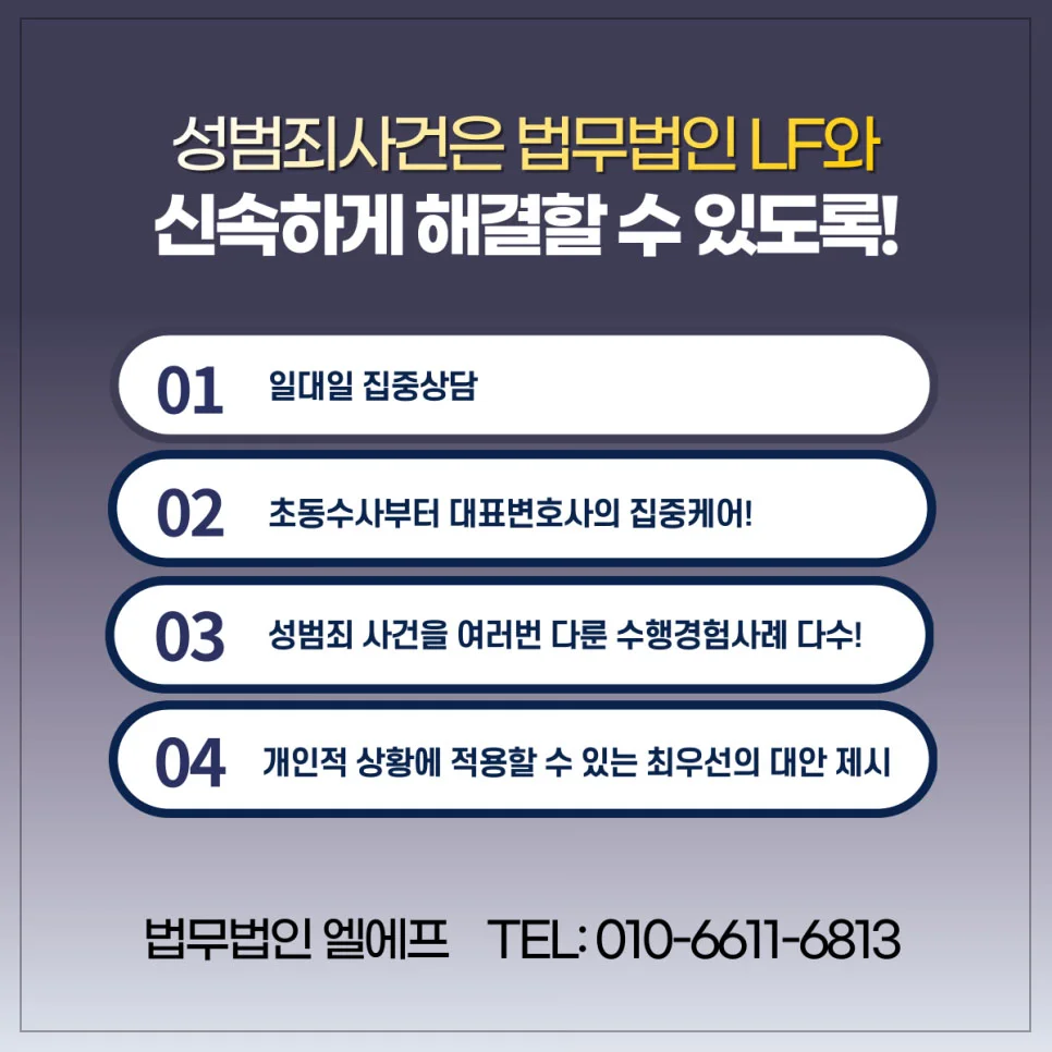 의뢰인은 범행이 한 번이 아닌 여러 번 반복되어 이루어졌기에 피해자의 정신적 충격이 매우 큰 상태에서 원만한 합의가 어려운 상황이었습니다. 그러하여 변호인은 피해자의 피해회복을 위하여 합의 절차를 진행하였고 의뢰인의 반성하는 마음을 거듭 전한 끝에 원만한 결과를 이룰 수 있었습니다. 그리고 스스로 재범을 막기 위해 정신과 진료를 받았음을 변론하여 선처를 구하는 등의 적극적인 조력을 펼쳐 집행유예 처분을 받았습니다.