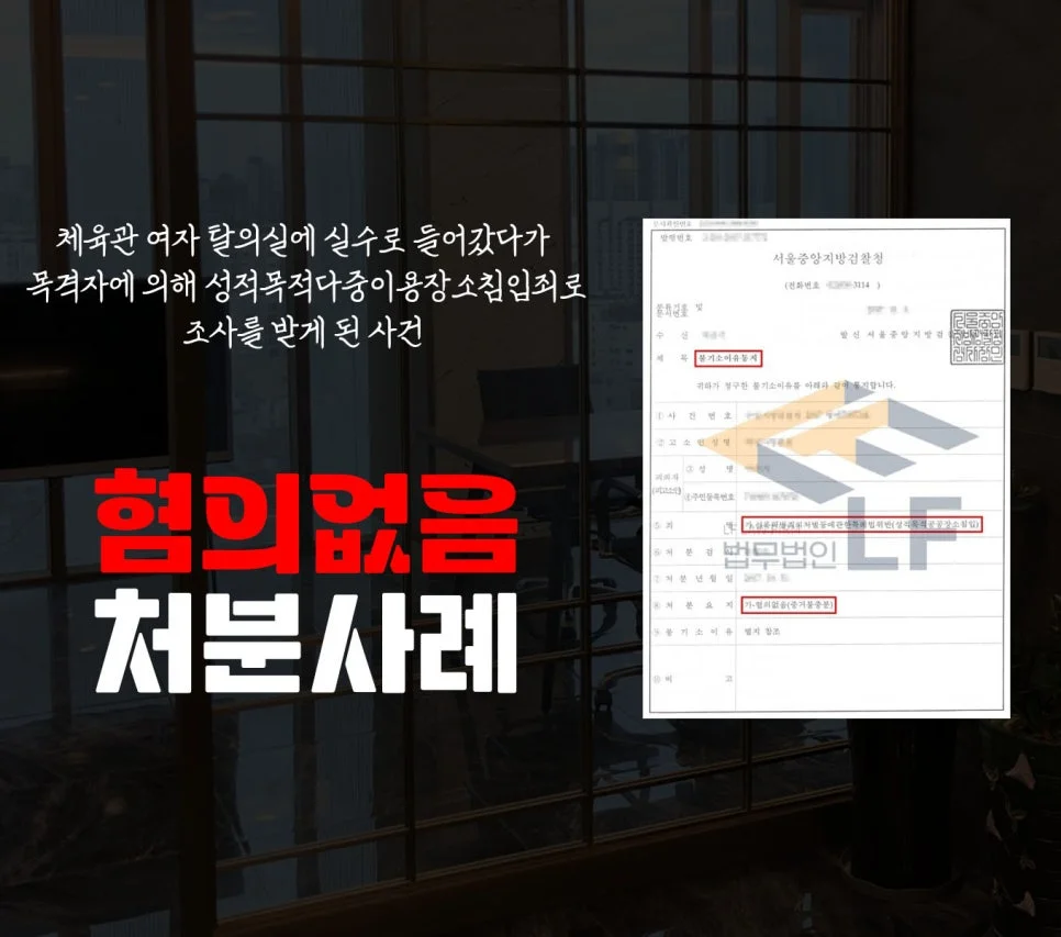 그래서 이 사건을 담당하게 된 변호인으로서 이 사건 당시의 상황과 정황을 상세히 담은 변호인 의견서를 제출하면서, 의뢰인이 성적인 목적 없이 여성 탈의실에 들어가게 되었음을 적극적으로 변호하여 수사기관을 설득한 결과 해당 사건에 대하여 혐의 없음 처분을 받아볼 수 있게 되었습니다.