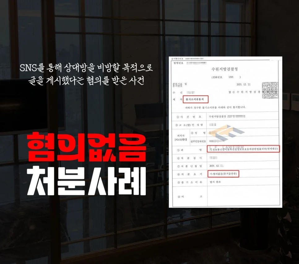 의뢰인과 상담을 하며 왜 이런 글을 게시한 것인지 경위를 확인해 보았고, 비방의 목적이 없었음을 강조하기 위한 취지로 조사를 받기 위해 예상 질문 내용을 정리한 후 조사에 임했습니다. 조사 이후에는 담당 수사관과 면담을 하며 추가 변론을 하였고 검찰에 송치된 후 최종적으로 변호인 의견서를 제출하며 무혐의 처분을 받을 수 있게 되었습니다.
