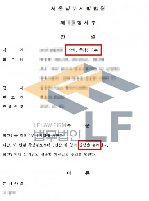 의뢰인은 피해자를 무차별적으로 구타하여 상해를 가했을 뿐만 아니라 피해자의 항거불능 상태를 이용하여 간음을 시도하는 등 죄질이 매우 좋지 않았기에 엄벌에 처해질 수 있는 상황이었습니다. 그래서 변호인은 의뢰인이 깊이 반성하고 있으며 피해자에 대한 사죄의 마음을 전달하여 피해자와 원만한 합의를 하였고, 의뢰인에게 필요한 양형 자료를 안내하고 수집에 조력을 드렸습니다. 또한 자료를 바탕으로 변호인 의견서를 제출하며 선처를 구한 결과 집행유예를 받을 수 있게 되었습니다.