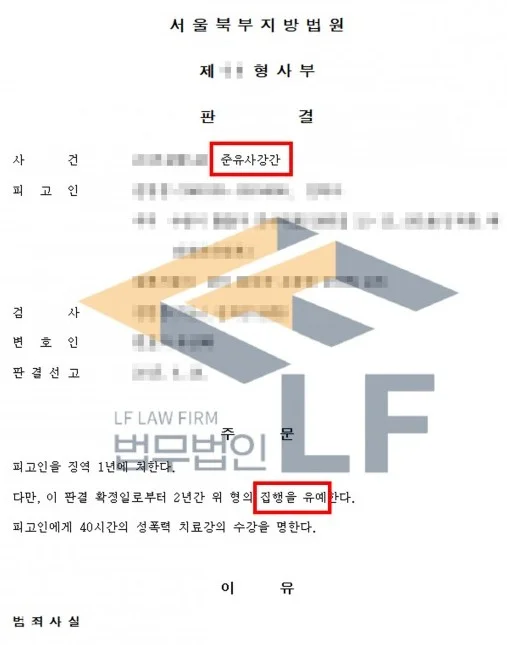 그래서 변호인은 피해자의 피해 회복을 우선으로 하여 합의 절차를 진행하였고, 원만한 합의를 통한 처벌 불원서를 재판부에 제출하였습니다. 또한 의뢰인에게 필요한 양형 자료를 안내하고 수집에 도움을 드렸으며 자료를 바탕으로 변호인 의견서를 작성하며 선처를 구해 해당 사건에 대해 집행유예를 받을 수 있게 되었습니다.