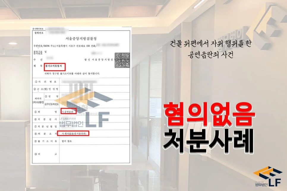 의뢰인은 건물 뒤편에서 자위 행위를 하다 목격자에게 신고를 당하여 공연음란죄로 입건이 되었으며 수사기관의 조사를 받게 되었습니다. 의뢰인은 허벅지 안 쪽이 너무 가려워 긁고 있었을 뿐 자위 행위를 한 적이 없다며 모든 사실 관계에 대하여 부인하는 상황이었습니다.