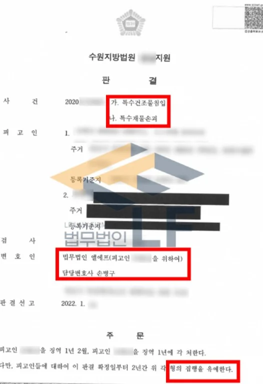 의뢰인은 근무중이던 오피스텔 사무소에서 해임을 당한 이후 새로운 관리자인 피해자의 관리를 배제하기 위해 다수의 공모인들과 범행을 계획하였고, 위협적인 물건을 사용하여 관리사무소 내부로 침입함과 동시에 후문을 손괴하여 특수건조물침입, 특수제물손괴죄로 수사기관의 조사를 받게 되었습니다.