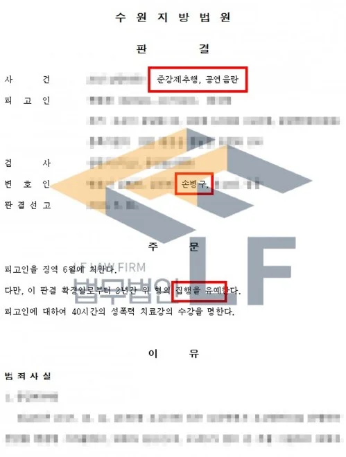 추행 정도가 가볍지 않았으며, 피해자의 정신적 충격으로 합의가 불가능하였기에 수위 높은 처벌이 예상되는 상황이었습니다. 그래서 사건을 담당하게 된 변호인은 의뢰인이 자신의 잘못을 인정하고 깊이 반성하고 있음을 변론하며 선처를 구하였고, 의뢰인이 양형 자료를 바탕으로 변호인 의견서를 작성하여 재판부에 제출하는 등의 적극적인 조력활동으로 집행유예를 받을 수 있게 되었습니다.