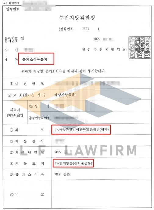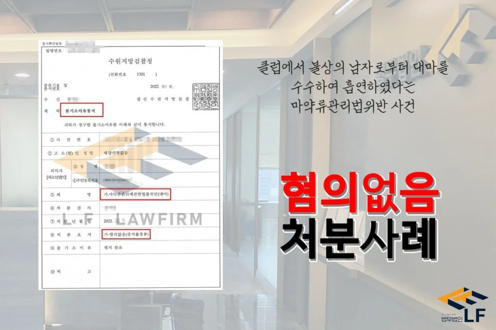 그래서 변호인은 의뢰인과 상담을 한 후 어떤 경위로 클럽에서 대마를 얻게 되었고 흡연을 하게 된 것인지 확인을 해보았고 1회 경찰 진술 내용을 정보공개청구를 통해 확인한 후 모발감정서와 시기적으로 일치하는 것이 맞는지 등을 강조하는 내용으로 변호인 의견서를 준비하였습니다. 이후 담당 수사관 면담과 담당 검사 면담을 거쳐 최종적으로 혐의 없음 처분을 받고 혐의를 벗을 수 있었습니다.