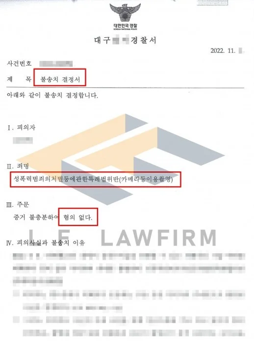 조사 후에는 피해 여성이 주장하는 진술 내용을 바탕으로 신빙성에 대해 의문이 나는 부분에 대한 내용들을 변호인의견서로 정리를 하여 제출하였습니다. 어느 정도 사건에 대한 검토 후 최종 불송치 결정을 받을 수 있었습니다.