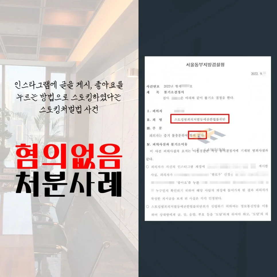 의뢰인은 예전에 연락을 하였던 사람을 대상으로 자신의 인스타그램에 글을 게시하고, 그 사람의 인스타 글 등에 좋아요를 눌렀는데, 이러한 의뢰인의 행동을 기분 나빠한 피해자는 의뢰인을 스토킹범죄의처벌등에관한법률위반죄로 고소를 하였고, 이에 의뢰인은 수사기관의 조사를 받게 되었습니다.