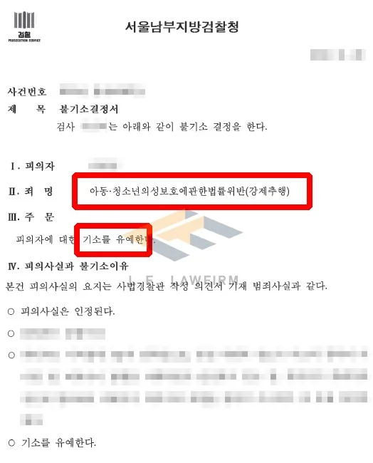 의뢰인은 이 사건 자신의 범행 사실들을 모두 인정하고 있었으나, 이 사건은 미성년자를 대상으로 한 강제추행죄 사건으로서 중한 처벌이 예상되고 있어 상황이 매우 좋지 않았습니다. 그래서 변호인은 피해자에게 의뢰인의 사죄하는 마음을 잘 전달하여 피해자와 원만히 합의하였고, 이에 더해 의뢰인의 정상관계 자료들을 잘 수입한 뒤 변호인 의견서를 작성하여 수사기관에 제출하면서, 의뢰인의 선처를 변론하는 등의 변호활동을 하여 기소유예를 받았습니다.