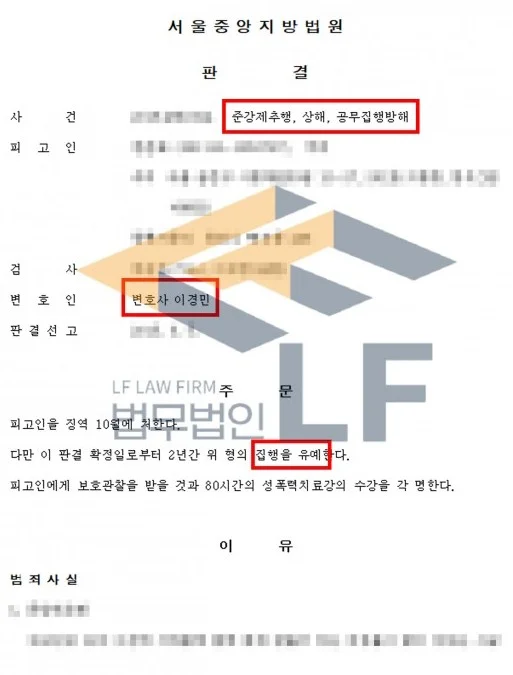 그래서 변호인은 피해자들의 피해 회복을 위하여 합의 절차를 진행하였습니다. 준강제추행 피해자와는 원만한 합의를 이끌어 내어 처벌 불원서를 받을 수 있었으며, 의뢰인에게 필요한 양형 자료를 안내 수집에 도움을 드렸고, 재범 방지를 위한 정신과 치료와 잘못을 깊이 뉘우치고 있음을 변론하며 선처를 구하였습니다. 또한 변호인 의견서를 작성, 법원에 제출하는 등의 조력활동을 하여 집행유예를 받았습니다.