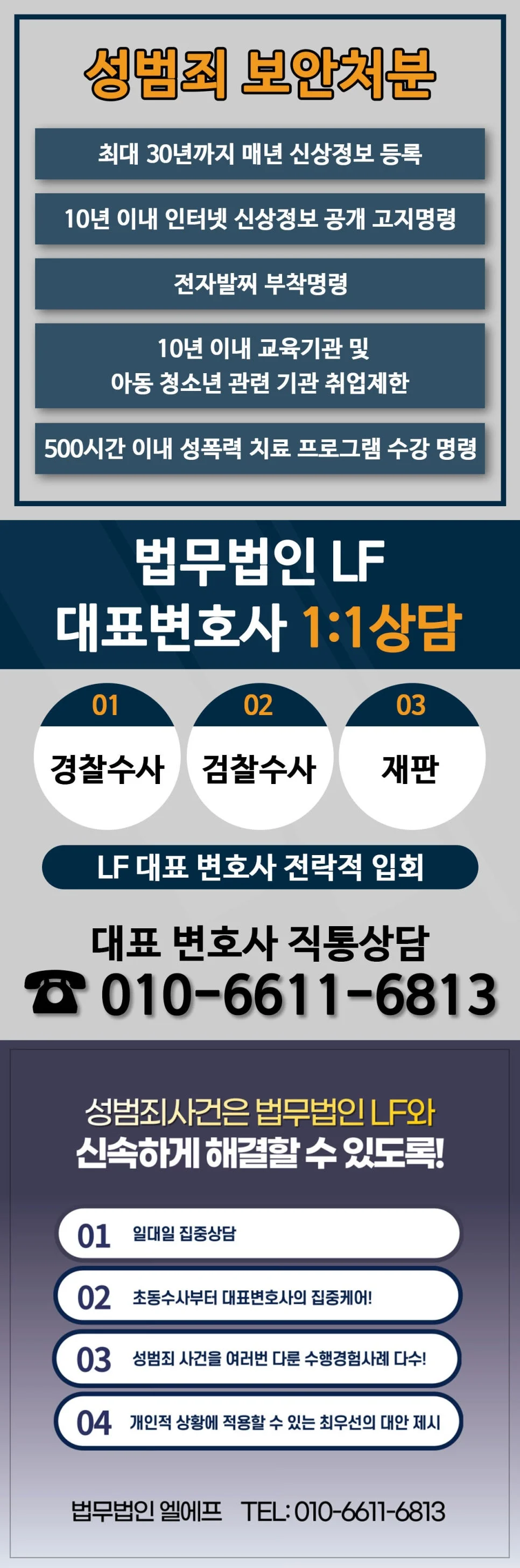 보안처분은 신상정보등록, 취업제한, 승진 불이익, DNA 채취 및 보관, 비자발급제한, 전자발찌 부착명령 등의 상당히 무거운 처분이라 볼 수 있습니다. 이것들은 모두 일상생활에도 영향을 미치고 경제활동에도 문제가 생기기 때문에 이 어떠한 것도 절대 단순하게 생각할 수는 없습니다. 일상을 보내는데 있어 상당한 불이익을 받게 되는 이 처분을 피하려면 초기 단계부터 철저히 준비하고 대응할 수 있도록 해야 하는데 이는 혼자서 수월하게 진행하기 어렵기 때문에 확실하게 법률적인 도움을 받아보도록 해야 합니다.