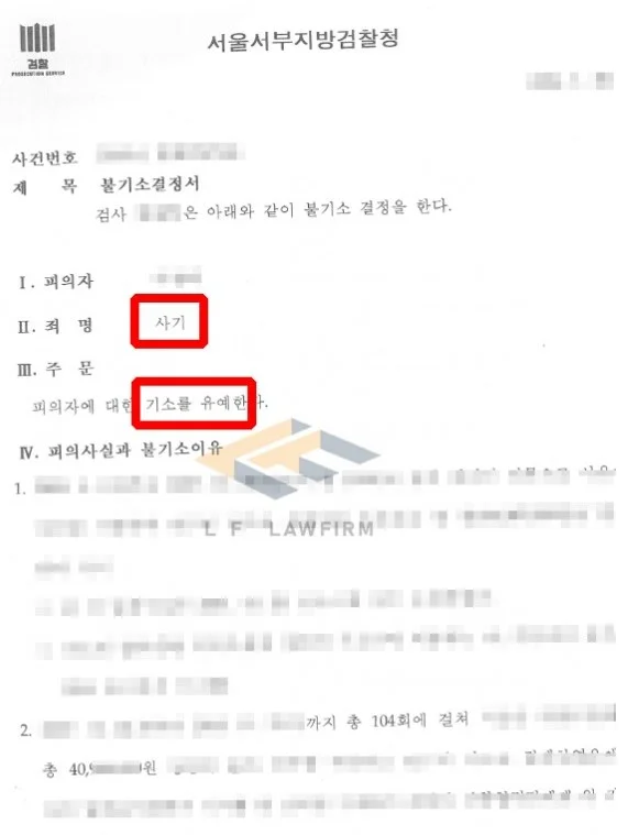 그러나 이 사건은 횟수와 금액이 큰 재산범죄 사건으로서, 무엇보다 의뢰인의 재범방지를 위한 노력이 매우 중요해 보였습니다. 그래서 변호인은 피해자와의 합의를 대행하였으며, 의뢰인의 정상관계 자료 등을 받아 변호인 의견서를 수사기관에 제출하며 선처를 구하는 등의 변호인 조력활동을 하여 기소유예를 받았습니다.