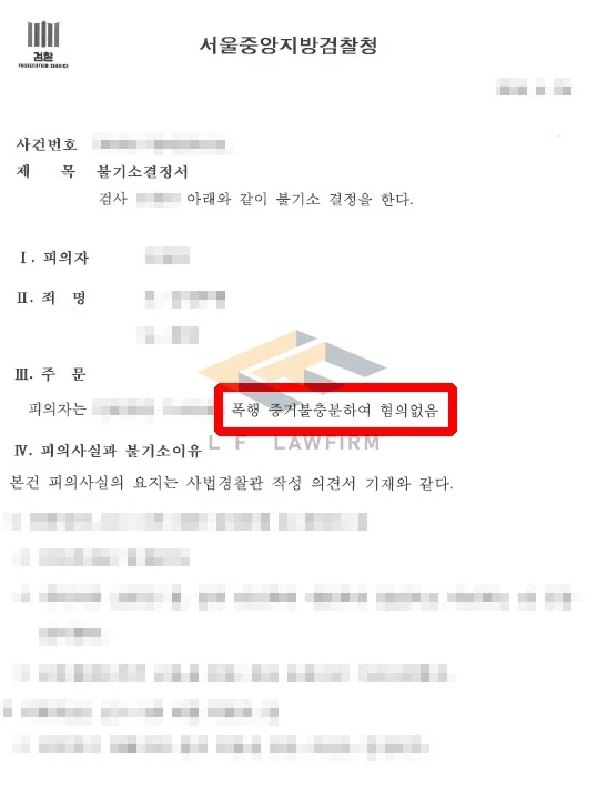 의뢰인은 당시 다른 일행과 시비가 붙어 이를 말리는 과정에서 멱살을 잠시 잡은 사실은 있었으나, 결코 피해자를 폭행할 고의가 없었다며 자신의 혐의에 대해 억울함을 토로하는 상황이었습니다. 이에 변호인은 폭행죄를 다투고자 의뢰인에게 유리한 증거를 수집하였고, 당시의 정황을 잘 담은 변호인의견서를 작성하여 제출하였으며, 피해자 주장의 신빙성이 없음을 주장하는 등 의뢰인을 위해 변론하여 혐의없음 처분을 받았습니다.