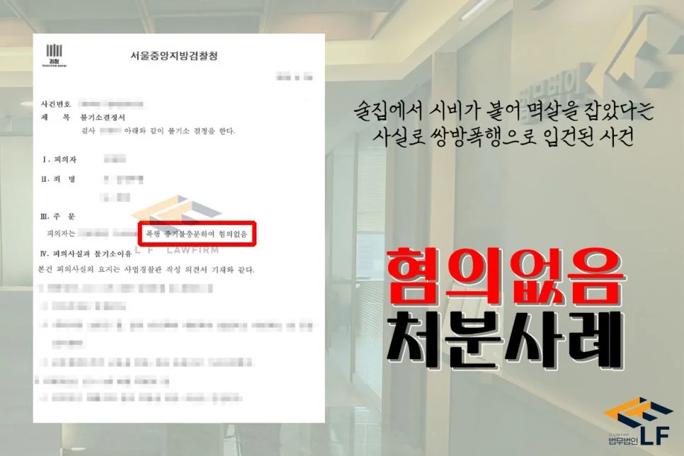 의뢰인은 술집에서 술을 마시던 중 술집을 이용하던 다른 일행과 시비가 붙었는데, 그 일행과의 시비를 말리는 과정에서 멱살을 잡는 상황이 발생하였고, 이에 쌍방폭행으로 입건이 되어 폭행죄로 수사기관의 조사를 받게 되었습니다.