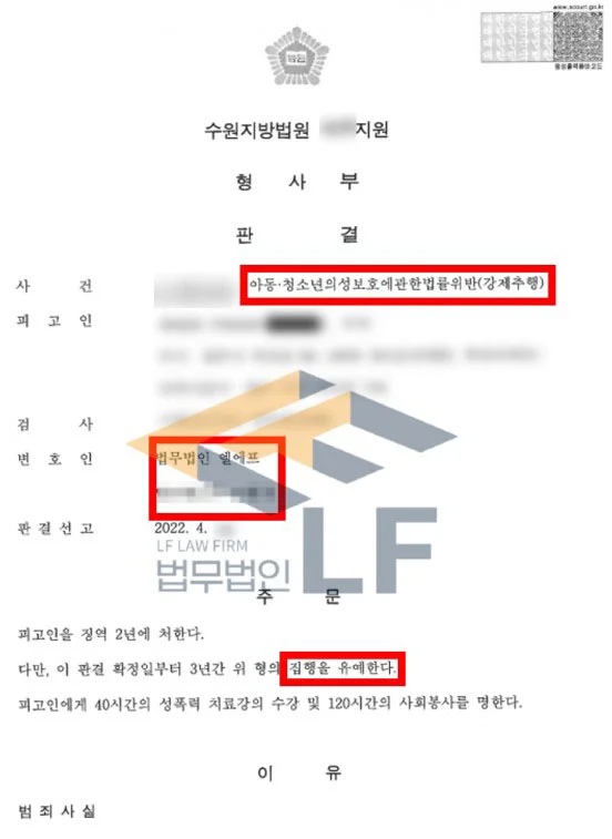 변호인으로서 의뢰인과 면밀한 상담을 통해 사건의 사실관계를 정확하게 파악하였고, 이후 의뢰인에게 유리한 양형 자료들을 잘 수집하여 변호인의견서를 제출하였으며 수사기관에서 조사를 받을 때 동석은 물론 재판에 출석하여서도 양형에 대한 적극적인 변론을 하였습니다. 그리고 이에 더하여 미성년자인 피해자들과 합의를 진행하여 피해자들 3명 모두와 원만히 합의하게 되었으며, 법원에 합의서 및 처벌불원서를 제출하며 다시 한번 의뢰인에 대한 선처를 요청하여 집행유예를 받게 되었습니다.