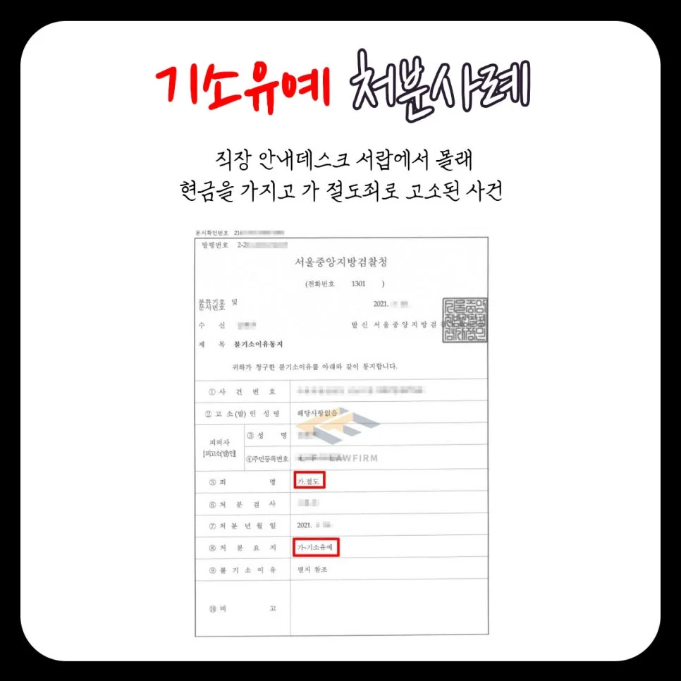 직장 안내데스크 서랍에서 몰래 현금을 가지고 가 절도죄로 고소된 사건