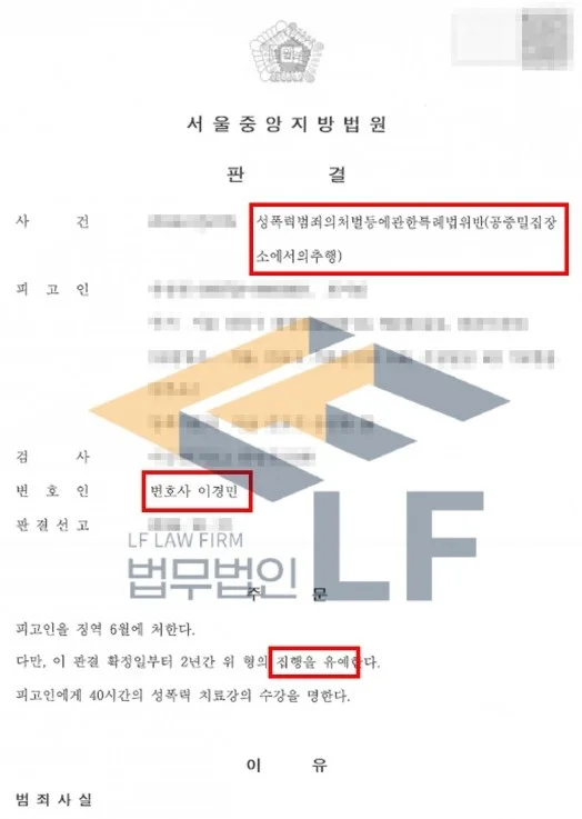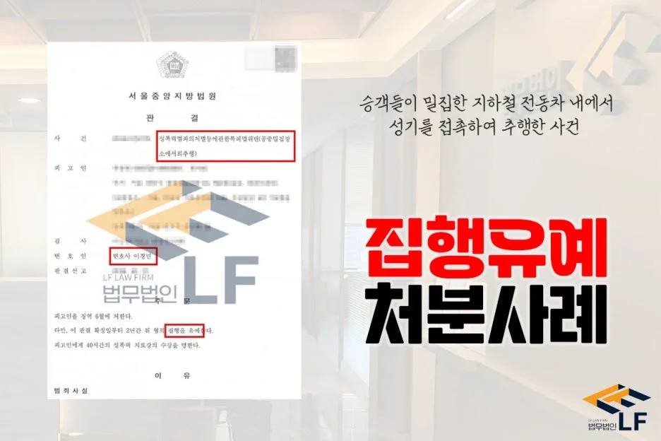 의뢰인에게는 2차례 동종 범죄 전력이 있었기에 수사기관의 시선이 좋지 않았으며 공중이 밀집한 지하철에서 추행하여 사안이 가볍지 않은 상황이었습니다. 그래서 변호인은 의뢰인의 범행을 인정하고 깊이 반성하고 있으며, 재범을 일으키지 않기 위해 약물치료 및 심리치료 등 정신과 치료를 성실히 받을 것을 다짐하고 있음을 변론하며 선처를 구하였고 의뢰인에게 필요한 정상 자료를 안내하는 등의 조력 활동을 하여 집행유예를 받을 수 있게 되었습니다.