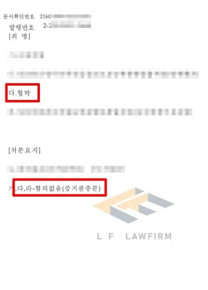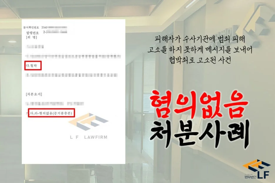 사건을 맡은 변호인은 사건 당시 발생하였던 사실관계를 자세히 살펴 의뢰인이 보낸 메시지가 협박성이 아님을 기재한 변호인 의견서를 작성하여 수사기관에 제출하였고, 이에 더하여 수사기관의 조사에 동석하여 의뢰인이 자신의 입장을 잘 설명할 수 있도록 조력하여 혐의없음 처분으로 마무리를 지을 수 있게 되었습니다.