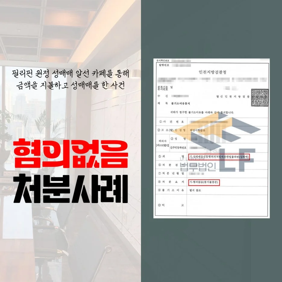 의뢰인은 온라인 필리핀 원정 성매매 알선 카페를 통해 운영자에게 금액을 낸 뒤 필리핀 현지 여성과의 성매매를 약속받았고 필리핀으로 출국하여 성매매한 혐의로 조사를 받게 되었습니다.