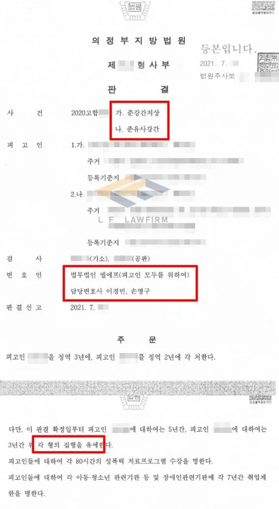 그리고 계속하여 중간중간 최대한 합의가 될 수 있도록 노력하여 결국 선고일을 앞두고 극적으로 합의를 하게 되었고, 변론 요지서를 추가로 제출하면서 최대한의 선처를 구하여 집행유예를 받게 되었습니다.