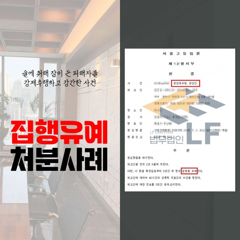 의뢰인은 지인들과 함께 술을 마시던 중 피해자가 술에 취해 잠이 들었고 지인이 담배를 피우러 간 사이에 피해자의 가슴을 만지고 입으로 가슴을 빨아 강제추행하였으며, 시간이 흐른 뒤 지인이 술을 사기 위해 집을 나가자 자고 있는 방으로 들어가 피해자를 간음한 죄로 재판을 받게 되었습니다.