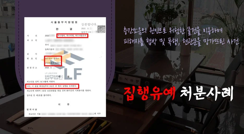 의뢰인은 층간 소음의 이유로 위층에 거주하는 피해자를 찾아가 소방용 도끼를 이용하여 폭행하였으며, 해당 물건으로 거주지의 현관문을 내리찍으며 위협적인 언행으로 협박을 한 사실관계로 특수협박, 특수폭행, 특수재물손괴의 혐의로 입건되어 수사기관의 조사를 받게 되었습니다.