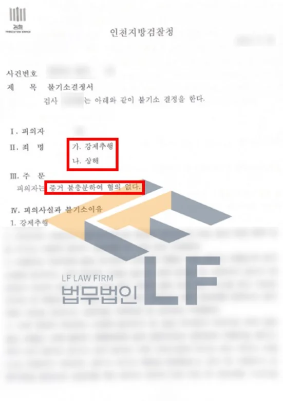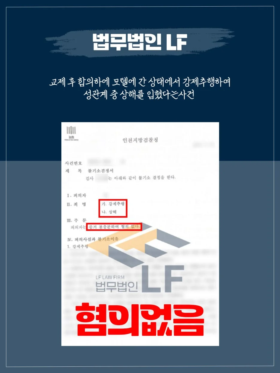 그래서 변호인 조력단은 피해자가 주장하는 혐의에 반박하는 주장을 펼쳤습니다. 강제추행 건에 대해서는 추행을 당한 직후에 피임을 조건으로 성관계를 허락했다는 점이 상식적으로 납득이 되지 않는다고 주장하였습니다. 그리고 상해에 대해서는 피의자가 성병 검사를 한 결과 감염된 사실이 없다는 의료진의 소견서를 바탕으로 변호인 의견서를 작성하여 수사기관에 제출하여 혐의없음을 받을 수 있도록 하였습니다.