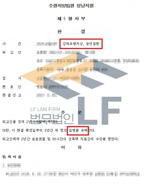 의뢰인은 이미 한차례 공연음란 혐의로 벌금형을 받은 적이 있으며, 범행 방법과 추행의 정도가 가볍지 않았기에 수위 높은 처벌이 예상되었습니다. 그래서 변호인은 의뢰인이 범행을 모두 인정하고 깊이 반성하고 있으며 정신과 치료와 약물 치료로 재범을 일으키지 않을 노력을 하고 있다는 점을 변론하며 선처를 구하였고, 의뢰인의 양형 자료를 바탕으로 변호인 의견서를 작성해 제출하는 등의 조력 활동을 하여 집행유예를 받게 되었습니다.
