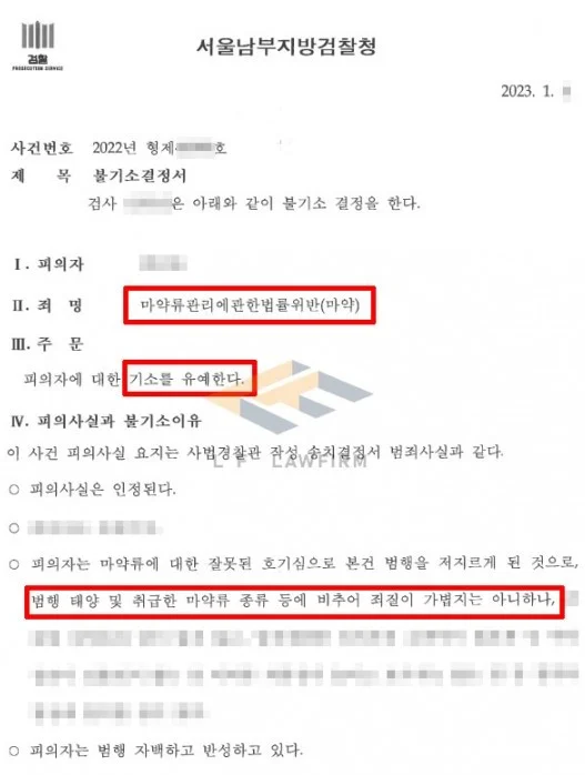 그래서 변호인은 의뢰인이 왜 인터넷을 통해 코카인이라는 마약을 접할 수밖에 없었는지. 이를 구입하여 사용 즉, 투약할 수밖에 없었는지 그 경위를 상세히 담은 변호인 의견서를 작성하여 수사기관에 제출하였고, 이에 더하여 의뢰인의 양형 자료 및 재범을 일으키지 않을 노력을 위한 자료들을 수집하여 수사기관에 추가로 제출하였으며, 이후 선처를 구하기 위한 검사 면담을 진행해 기소유예를 받을 수 있게 되었습니다.